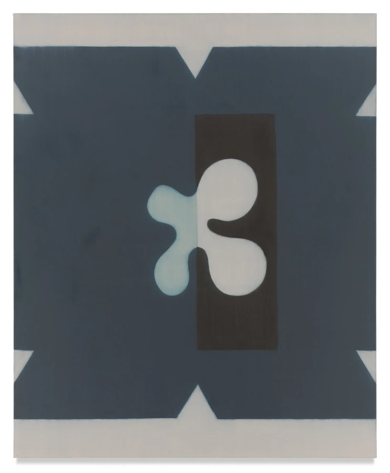 For this writer, one of the most elegant and beautiful works is 759 (specimen) (2020), in which a light, flower-like, four-petaled image exists is the middle of a black design--a solid mass with small V-shaped cutouts on top and the sides. One half of the central image, which can be likened to a cutout by Matisse, is colored a pale blue on the left and has a tall black rectangle backing its right half. The word “specimen” suggests that this is indeed a flower found and picked in the fields; it cannot be said that Caporael’s art is completely abstract. But the forms are simplified to the point of losing any specificity that would identify them within nature. As a result the image’s possible natural origins are worked into a pattern indicative of painting and culture--this may be a good way of describing the artist’s method in general. The painting 749 mask (blow me a kiss) (2020) is a very simple design: a wedge of a black circle, within which is an oval space. Next to this black design is an orange oval whose size fits the open space in the black image. The background is a neutral tan. One hesitates to read so open-ended a pattern as anything but abstract, but then that is its strength. The design is comely in the extreme.